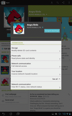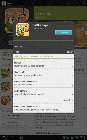 One of my favourite games on Android is Cut The Rope. I had a look at the permissions required for the different versions. There are three versions - Free, paid and HD. As a tablet user I have the HD edition (which isn't free). It requires the coarse location permission. This allows the game to determine the approximate location of the user without giving it access to the GPS. This is perfectly reasonable in my opinion. After all, any app with access to the internet can gain this information without needing the location permission anyway. As to why it needs it, I've no idea, but as I said, I've no issue with it knowing roughly where I am. As a developer I like to know stuff about my users so I can tailor my future stuff to them, I'd be surprised if others didn't think the same way. A little worrying is the fact that it wants to know the device's phone number, but as my device is a tablet with no phone function I guess this doesn't really apply to me. I'd hesitate before installing the app on my phone though. But look - the free edition requires the fine location permission, which allows the app access to the GPS. This runs true with my earlier assertion that you pay for free apps with your privacy. The app only wants to know exactly where you are if you don't pay up.