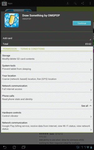 Now, I'm aware that sometimes the free version of an app will require access to the user's location mainly to decide which adverts to show (pointless showing an ad for a service only available in the US if the user is in the UK for example) It's only fair - you still pay for the app, just not in financial terms; you pay either with your time (reading ads) or your privacy (app collects lots of info on you) but in this case the game wants to know the location of the user even if they opt to pay, which isn't right. More worryingly, it asks for the fine location - the actual GPS position (potentially accurate to within a metre) of the user, rather than just the network location. Fair enough, if a developer wants to know I'm in Southampton I've no real issue with that - but I don't want them knowing my exact address. I decided not to install Draw Something.