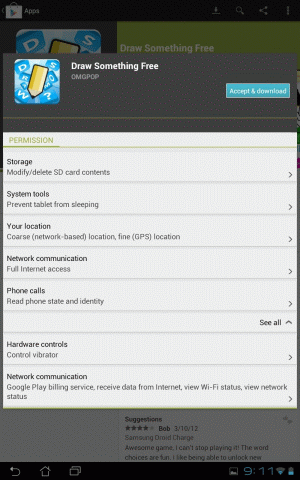 But let's look at another example - the ubiquitous Angry Birds. As far as I can tell, Android has no paid version, the only version is the free one (not counting the sequels, Rio and Space). Even so, the game doesn't want to know exactly where you are, just roughly. And as it's a free app, with ads all over the place, I think this is fair enough. In fact, Rovio are so intent on people not getting the wrong end of the stick that they went public [talkandroid.com] with the reasons behind all the permissions required to run Angry Birds (or, to be more precise, one of its sequels) on an Android device. They specifically mention that they didn't feel the need to request a precise GPS-based location for the user in order to target their adverts. So when one of the market leaders says things like that, OMGPOP, developers of Draw Something, had better follow suit or at least give a damn good reason for not doing so. Sadly, there doesn't seem to be any kind of privacy information for the app on their website. Their privacy policy only refers to the website itself, and the one page on the site relating to Draw Something has nothing other than a promotional video and links to the various app stores.